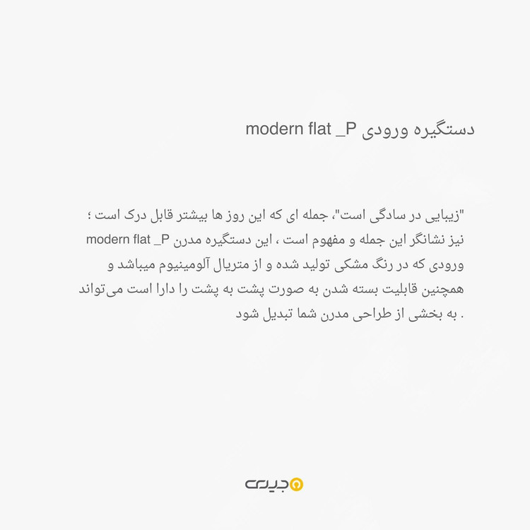 دستگیره ورودی modern flat_P فروشگاه مجیری، در راستای تکمیل سبد محصولات خود و فراهم کردن جدید ترین مدل های دستگیره، جدید ترین محصولات را برای شما مشتریان گرامی فراهم می کند. برای بهرهمندی اختصاصی از این ویژگی، تنها کافیست به پیج زیر مراجعه نمایید. مجموعه مجیری همواره تلاش می کند تا رضایت کامل مشتریان خود را جذب نماید. بالا ترین کیفیت ____ مشهد بین قرنی ۲۸ جنب درمانگاه بین قرنی ۳۳ و۳۵ نبش کشاورز ۳ 09151109212 09151159716 05137244433